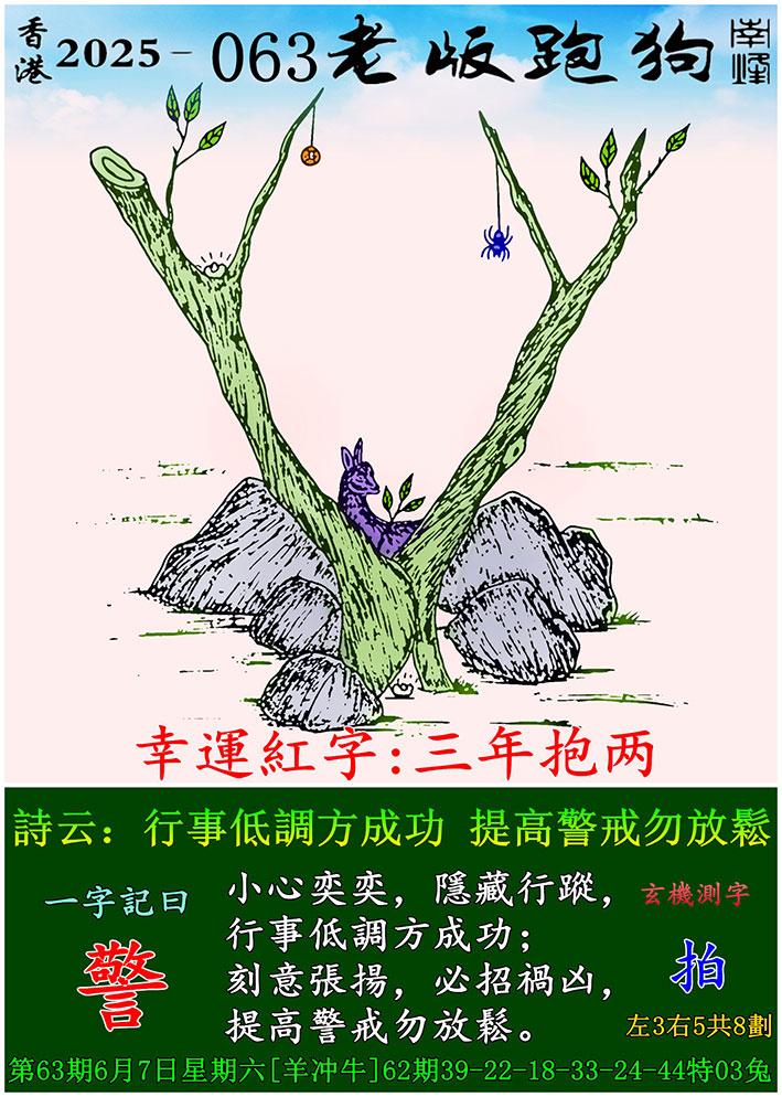 063期老版跑狗一字記之曰:【警】 詩雲:行事低調方成功,提高警戒勿放鬆。
