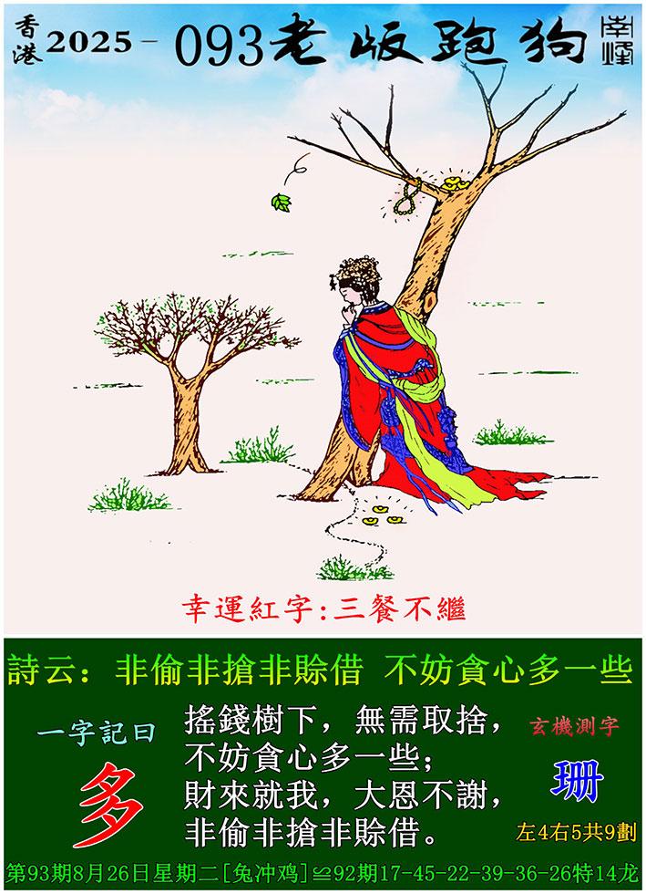 093期老版跑狗一字記之曰:【多】 詩雲:非偷非搶非賒借,不妨貪心多一些。