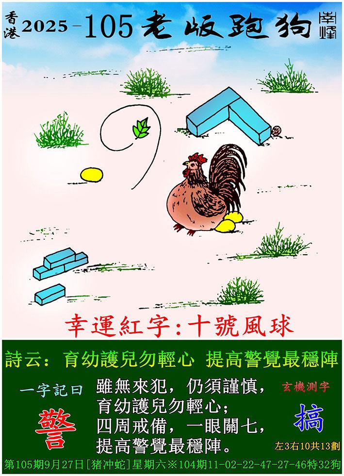 105期老版跑狗一字記之曰:【警】 詩雲:育幼護兒勿輕心,提高警覺最穩陣。