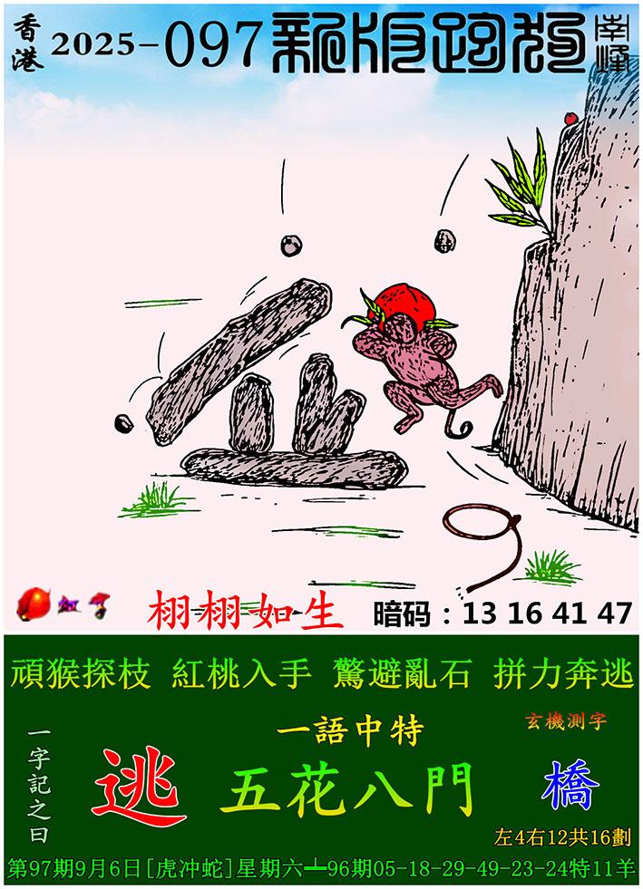 097期新版跑狗一字記之曰:【逃】 玄機測字:《橋》 一語中特:五花八門